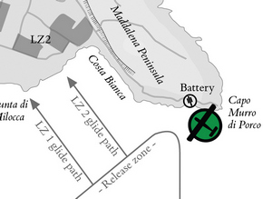 Fairly quickly they came under fire from machine guns on the top of the cliffs. A battery of three large anti-ship guns was located on the cliffs, not far from the lighthouse at the tip of the cape. Named “Lamba Doria” after an Italian naval hero, the battery was equipped with searchlights and surrounded by barbed wire. Its defences included machine guns against ground attack and 20mm AA cannons against air attack. It was these that had poured AA fire at the gliders as they approached, hitting Chatterton’s glider as he banked it steeply to avoid crashing into the cliff face.