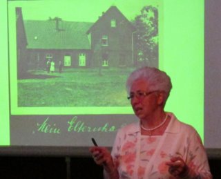Frau Busch telling her story with a picture of her parents’ farmhouse in the background.