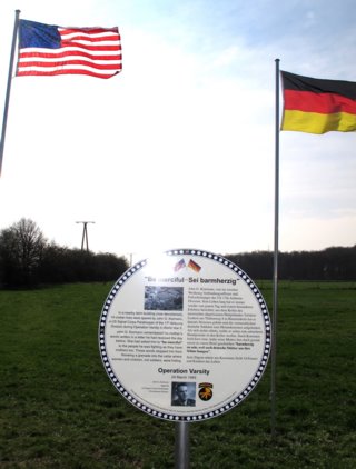 The unveiling of the plaque was a happy closure for his daughter, marking the end of an extraordinary journey to find the places and meet the people of Operation Varsity. As both the American and German flags fluttered in the cool spring breeze, their halyards clinking against the poles, there were tears of sorrow, tears of pride and tears of joy.
