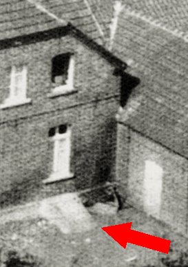 A blow-up of the picture of the farm, with an arrow pointing to the root cellar doors. These are the doors Kormann gingerly opened while holding his grenade.
