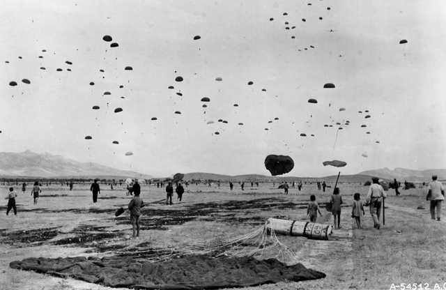 By British request, Greek civilians at Megara helped British paras deflate their chutes and gather their supplies. Source: US National Archives