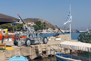A WW2 Bofors AA gun incongruously set among the seafood restaurants in the marina at Pachi, just south of Megara airfield.