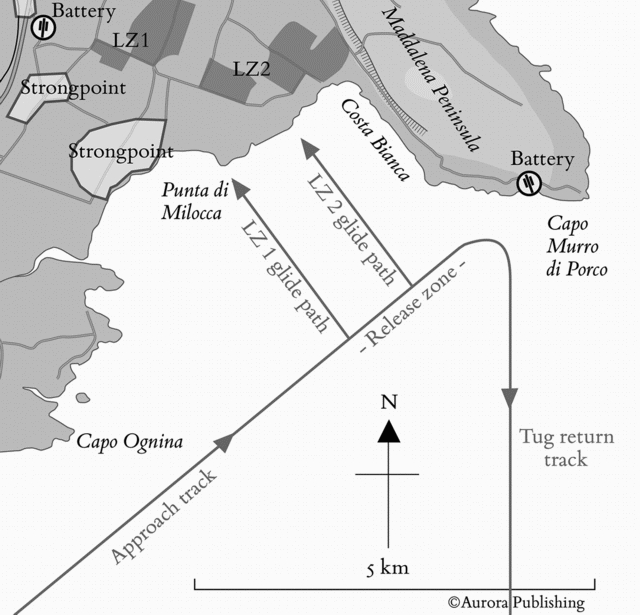 “When approx off the twin headlands flak came up from there & CAPE MURRO DI PORCO. The tug A/C immediately made a 180° right hand turn & headed East away from land. Tug A/C then ordered release by signal when at 1400 ft. After release glider glided at 75-80 m.p.h. in direction of nearest land, but was unable to reach it & came down in sea approx 4 miles off CAPE MURRO DI PORCO. Glider pilot was unable to recognise any point on land as tug flew Eastwards out to sea prior to release.”